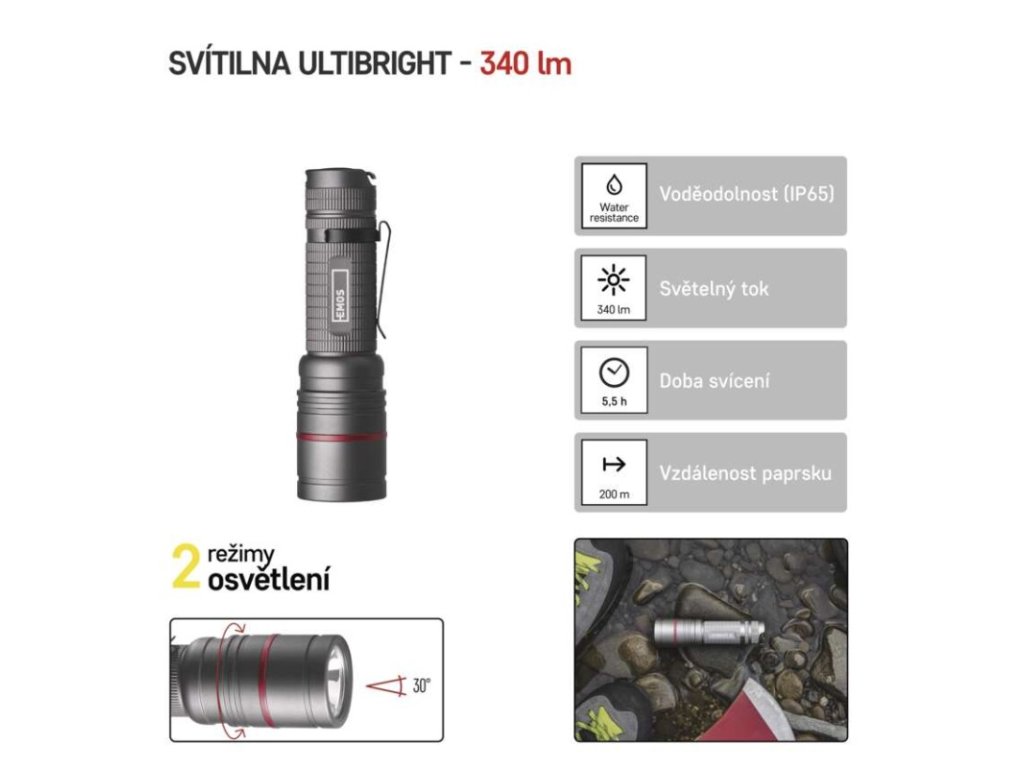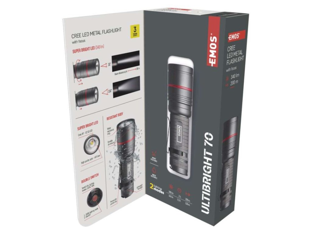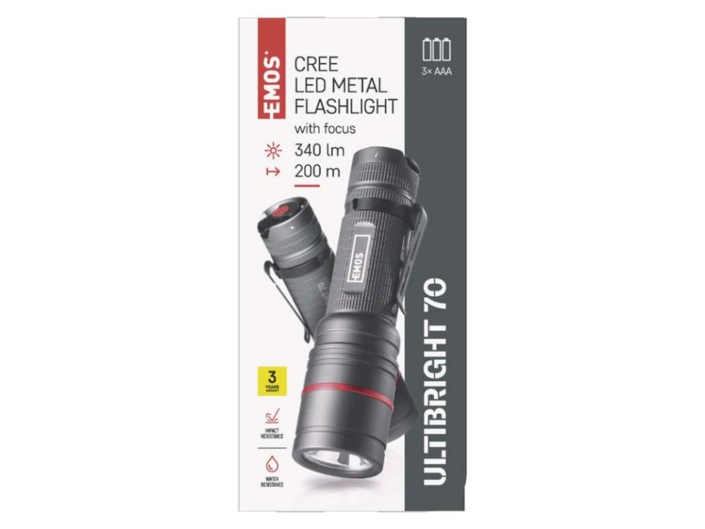 LED svítilna EMOS Ultibright 70 je kompaktní, odolná a výkonná. S CREE LED chipem a AFS lens technologiemi dosahuje světelného toku 340 lm a dosvitu až 200 m. Ideální pro outdoor, práci a každodenní použití.