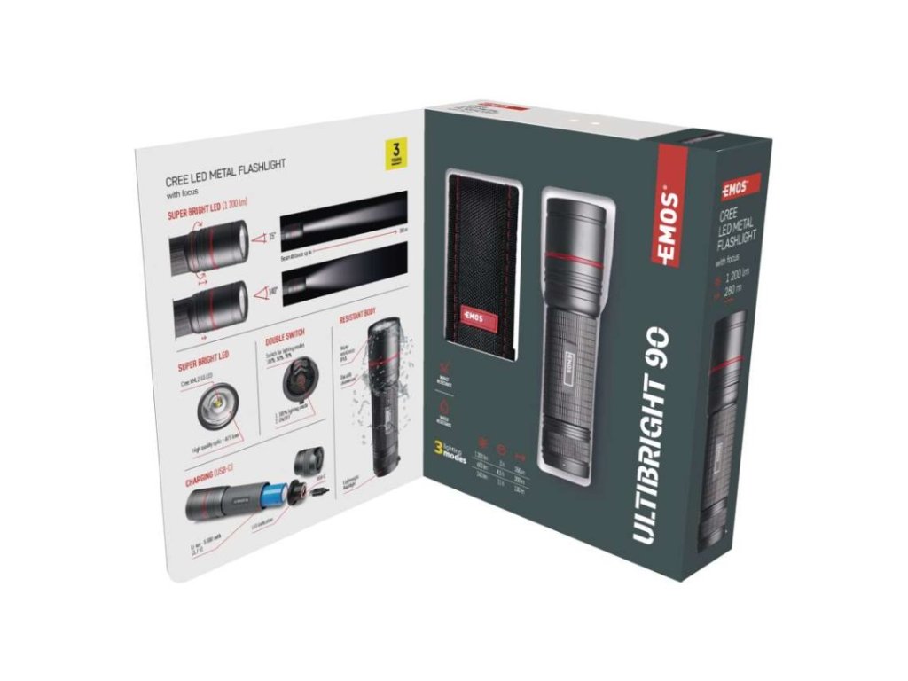 Kompaktní, odolná LED baterka na svícení EMOS Ultibright 90 je ideální pro profesionály i outdoorové nadšence. S CREE chipem dosvítí až 280 m a nabízí tři režimy svícení.