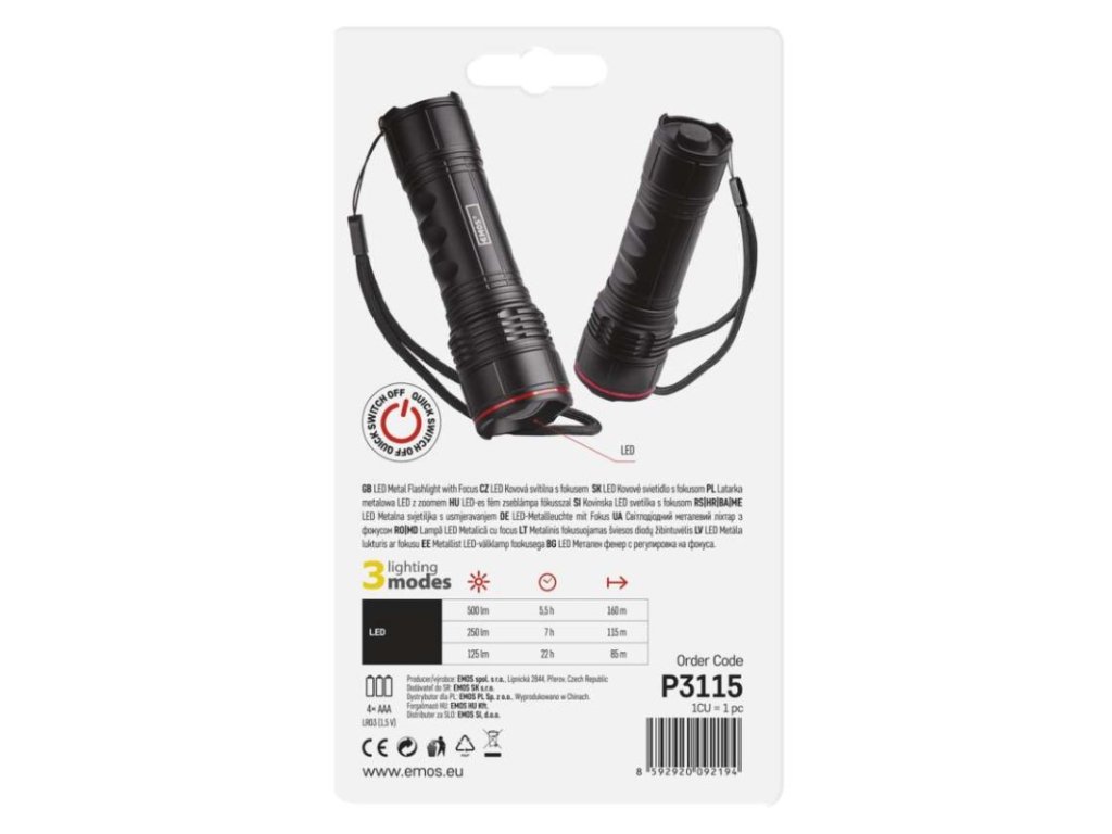 Výkonná LED baterka s třemi režimy svícení, dosvitem až 160 m a světelným tokem 500 lm. Tato ruční baterka z odolného hliníku nabízí fokus, voděodolnost IP44 a je ideální jako praktická baterka na svícení do auta, dílny i na výlety. Napájení pomocí 4× AAA baterií.