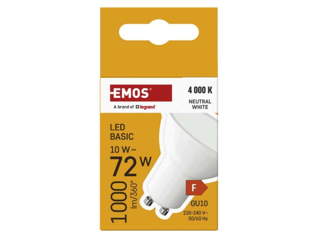 Patice GU10, tvar MR16, příkon 10W, světelný tok 1000lm, neutrální bílá (4000K), nestmívatelná, CRI 80, úhel svícení 110°, životnost 20 000 hodin, napětí 220–240V, energetická třída F.