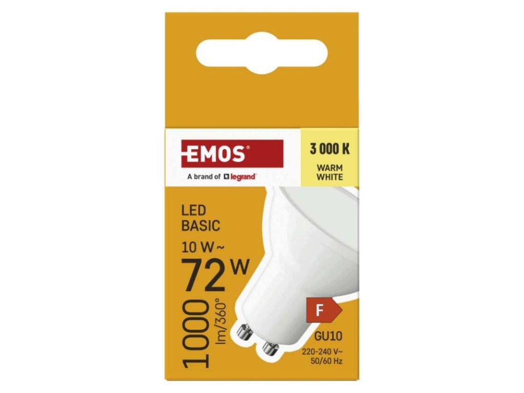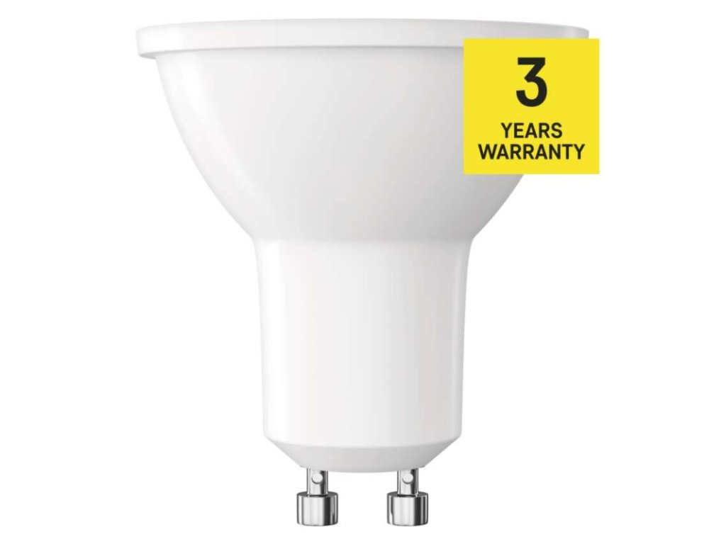 Patice GU10, tvar MR16, příkon 10W, světelný tok 1000lm, teplá bílá (3000K), nestmívatelná, CRI 80, úhel svícení 110°, životnost 20 000 hodin, napětí 220–240V, energetická třída F.