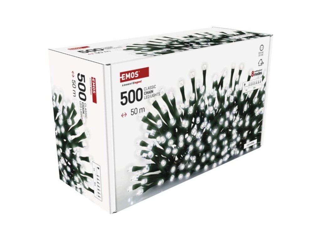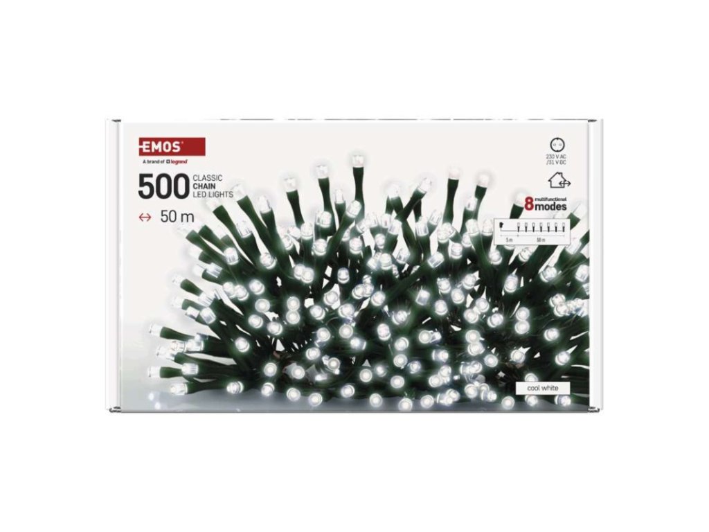 LED vánoční řetěz EMOS o délce 50 m se studenou bílou barvou světla a 500 LED dokonale rozzáří každý prostor. Nabízí 8 světelných programů, časovač, krytí IP44 a je vhodný ven i dovnitř. Ideální pro velké stromky a bohaté vánoční osvětlení.