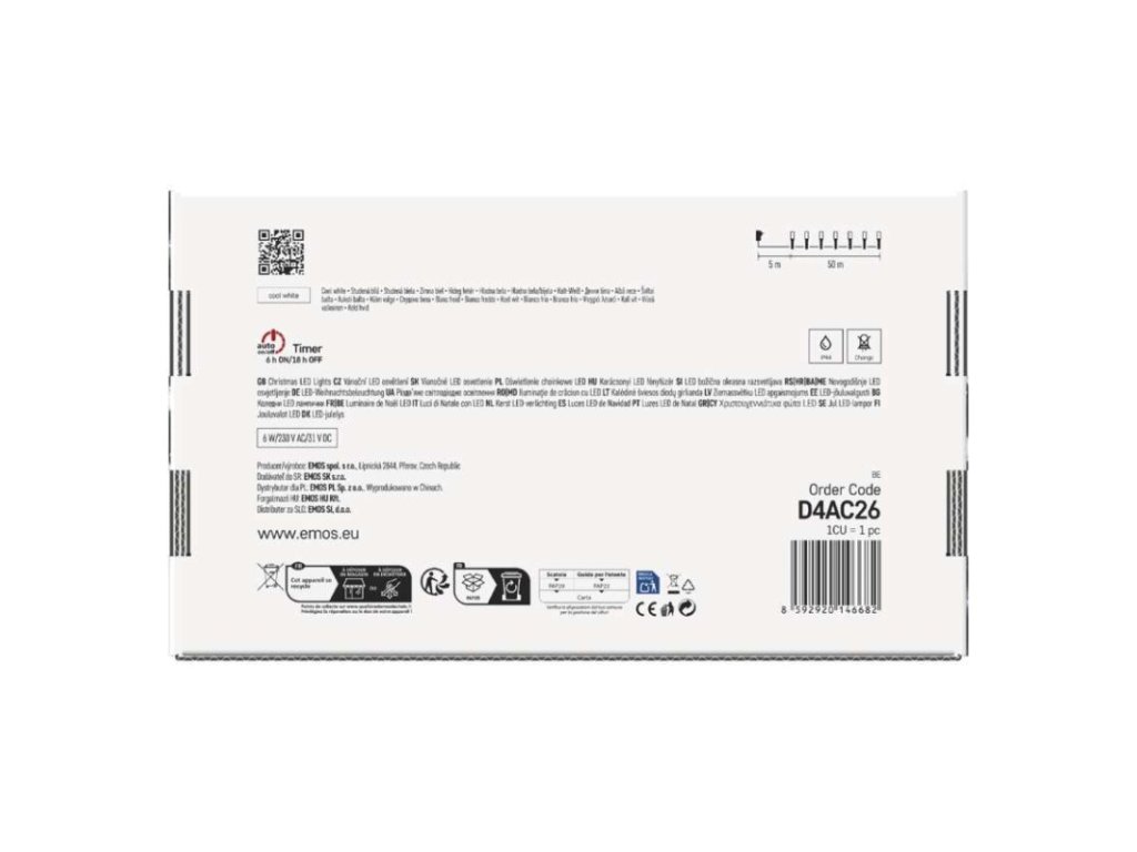 ED vánoční řetěz EMOS s délkou 50 m je perfektní volbou pro rozsáhlé a efektivní vánoční osvětlení. Studená bílá barva vytváří elegantní zimní atmosféru, která vynikne na velkých stromech až do výšky 300 cm, fasádách, oknech i v interiéru. Řetěz obsahuje 500 LED s nízkou spotřebou 6 W a dlouhou životností 10 000 hodin. Nabízí 8 světelných módů, praktický časovač a bezpečné napájení 31 V DC. Díky krytí IP44 je vhodný pro venkovní i vnitřní použití. Zelený kabel splyne s větvemi a 5m přívod usnadní instalaci. Spolehlivá volba pro ty, kteří chtějí opravdu výraznou vánoční dekoraci.