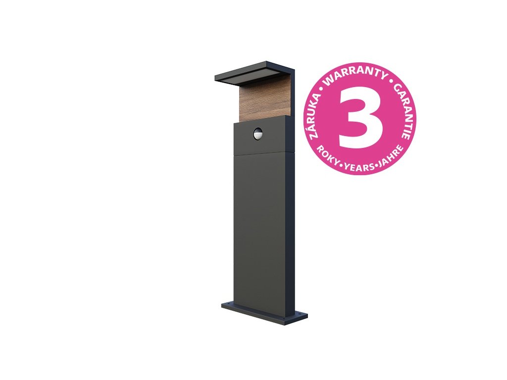 Zahradní lampa stojací LED s hranatým designem s prvky v imitaci dřeva a pohybovým PIR senzorem. Senzory mají nastavitelný čas (TIME) a intenzitu světla (LUX). Svítidla jsou vyrobena z tlakově litého hliníku, jsou opatřena komaxitovým, antracitovým lakem a plastovým krytem. Neutrální barva světla 4000K podtrhuje jejich minimalistický design. Skloubení antracitové barvy a nasvětleného dřeva působí nezvykle luxusním dojmem. Vhodné k osvětlení cesty, schodiště, areálu, zajímavé solitery Vaší zahrady. Velmi nízká spotřeba. Výška sloupku: 60cm. LED = “Light-Emitting Diode” V překladu “dioda emitující světlo” označuje elektronickou polovodičovou součástku obsahující P-N přechod. V současné době světelné zdroje s LED technologií zcela nahradili klasickou žárovku a postupně dále nahrazují další typy světelných zdrojů jako halogeny a zářivky. Toto je způsobeno vlastnostmi, které LED technologie nabízí: + dlouhá životnost světelného zdroje + odolnost vůči otřesům, zapínání a vypínání + nízká spotřeba Tento trend je navíc podpořen celosvětovým tlakem na energetické hospodářství, kdy mnoho států přijímá restrikce pro snížení spotřeby elektrické energie. Z tohoto důvodu se dostávají LED zdroje do všech světelných aplikací – průmysl, kanceláře, domácnosti, dekorativní osvětlení, pouliční osvětlení, osvětlení sportovišť či společenských akcí. PRODLOUŽENÁ ZÁRUKA JE PODMÍNĚNA REGISTRACÍ NA ZARUKA.PANLUX.CZ